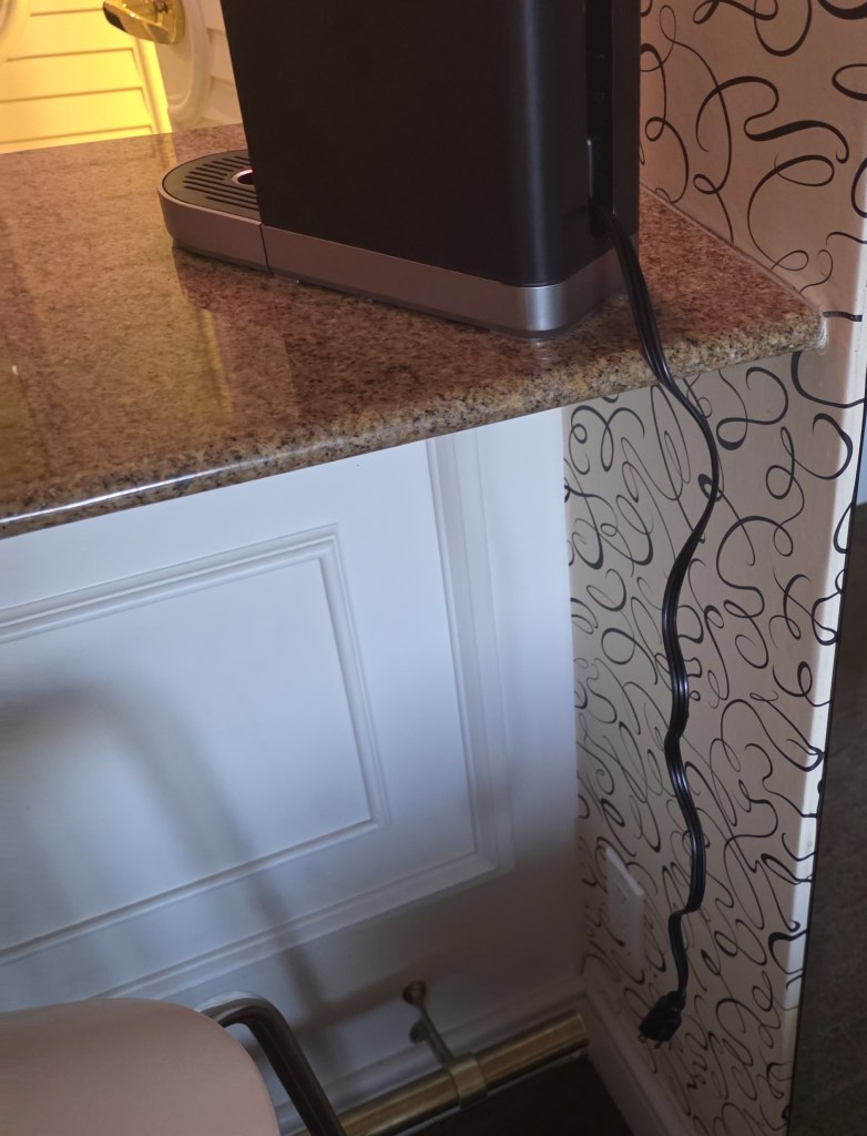In fact, the plug would not reach the outlet even if I sat the coffee maker on one of the barstool seats next to the coffee maker. The only place with a flat surface next to a plug where I could use the coffee maker was the nightstand next to the bed. So, to brew morning coffee, I needed to either brew it while sitting on the floor, while balancing the coffee maker precariously on my luggage, or by moving the whole thing into the bedroom.