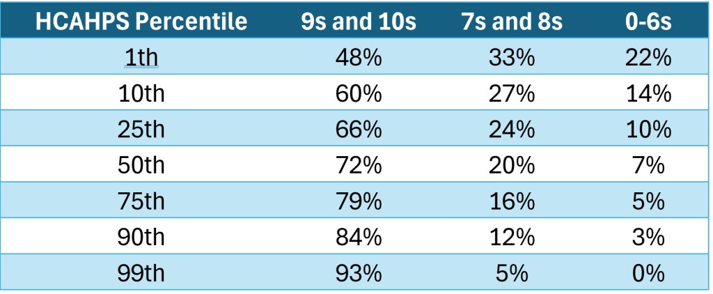 Everything in the example above is based upon assumptions, so you might imagine that if those assumptions were different, or, if an organization worked hard enough, they could win by just not losing as often. But, if that were the case, if one could do that, why hasn’t anyone done it? Even high-performing hospitals still have crabby patients. I calculated the percentiles from the HCAHPS data and put them in the table below. Note that these are percentiles based exclusively on the score for that NPS category, so while the horizontal lines are close to 100% in each case, you should not expect them to add up to exactly 100% in each case.