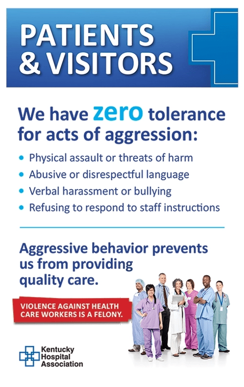 Outside of clinical repercussions, this focus on the problematic minority has caused us to define patients in a very clear way—as problems until otherwise notified. Workplace violence is a real problem. After suffering in silence, hospitals have been publicly proclaiming that their space is violence-free and those who violate this will be dealt with severely. Signs like the one below are cropping up across the country. Please note that I mean disrespect to the state of Kentucky. These were just the first ones I found in my Google search. Kentucky is not unique in its desire to protect staff.