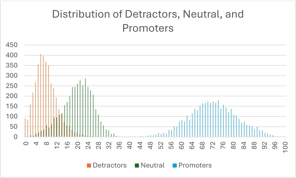 - If the data was truly bimodal, the percentage of red detractors would overlay on top of the blue promoters. That is, the percentages of those two groups would be closer together. They are not. At the very least, the green neutrals should be at the far left end, since neutral people are not taking the survey, according to the myth.